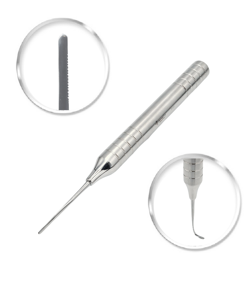Idealnie sprawdza się przy usuwaniu mlecznych kłów. Jego elastyczne właściwości pozwalają dostosować się do krzywizny zęba i jednocześnie doskonale przecinają więzadło przyzębia.